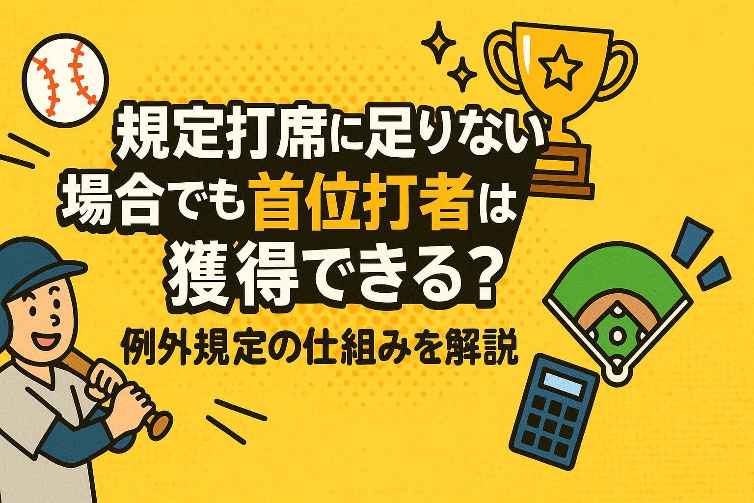 規定打席に足りない打者でも首位打者のタイトルを獲得できるかどうかという疑問に対しては、「例外規定(認定首位打者制度)があり、不足分を凡打と仮定して計算しても規定到達者のトップ打率を上回れば獲得できる」というのが答えになります。
